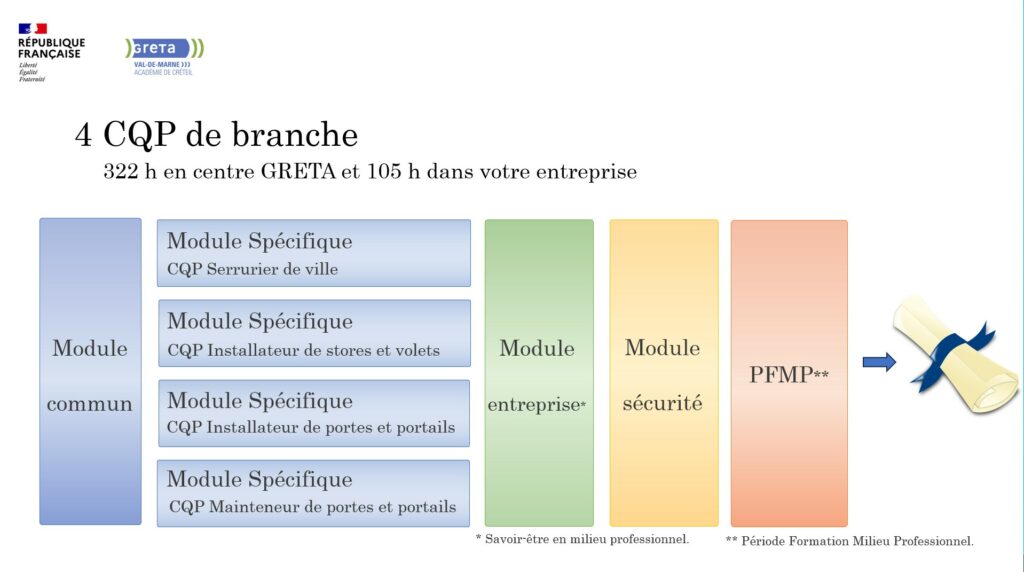 -La formation d’une durée maximale de 150 heures sur environ 10 semaines comprend un module commun aux quatre CQP et des modules spécifiques propres à chaque spécialité.