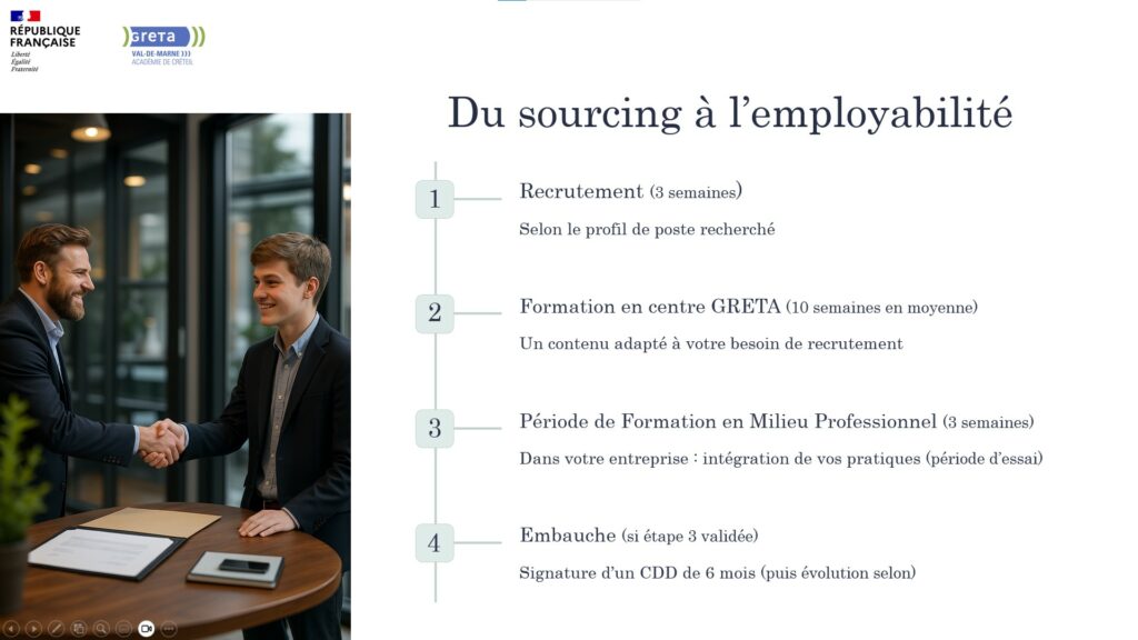 -Le recrutement qui s’effectue avec l’entreprise recruteuse qui exprime ses besoins afin que le Greta puisse sourcer la bonne personne